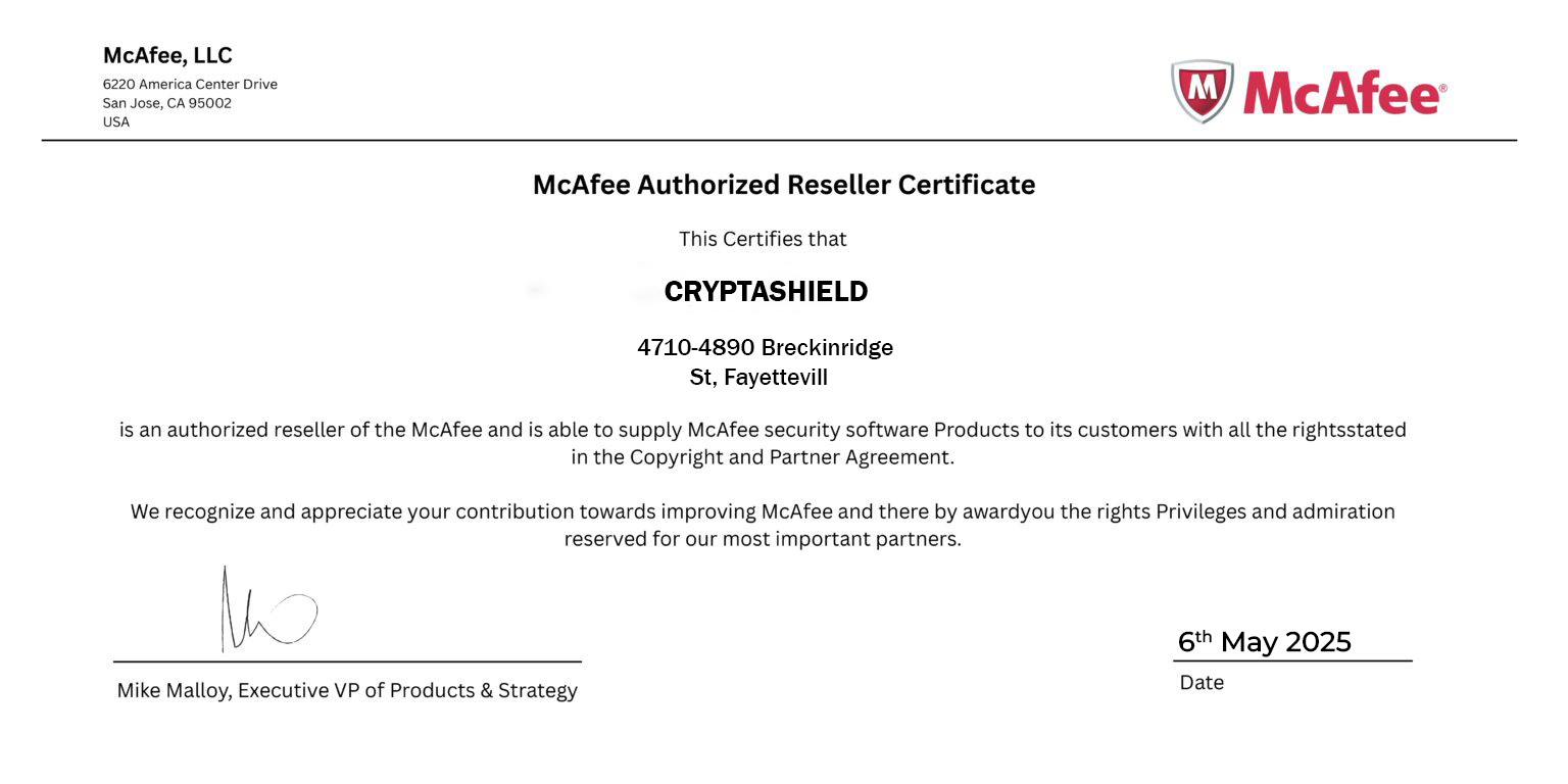 We are proud to announce that CRYPTASHIELD, located at 4710-4890 Breckinridge St, Fayettevill , has been officially certified as an Authorized Reseller of McAfeeLifeSave Inc. This certificate, issued on May 6, 2025, is valid from May 20, 2025, to July 21, 2029, unless otherwise terminated in writing by McAfeeLifeSave Inc. As an authorized reseller, CRYPTASHIELD is empowered to market, sell, and support McAfeeLifeSave’s comprehensive cybersecurity solutions in accordance with the terms outlined in the McAfee Authorized Reseller Agreement.